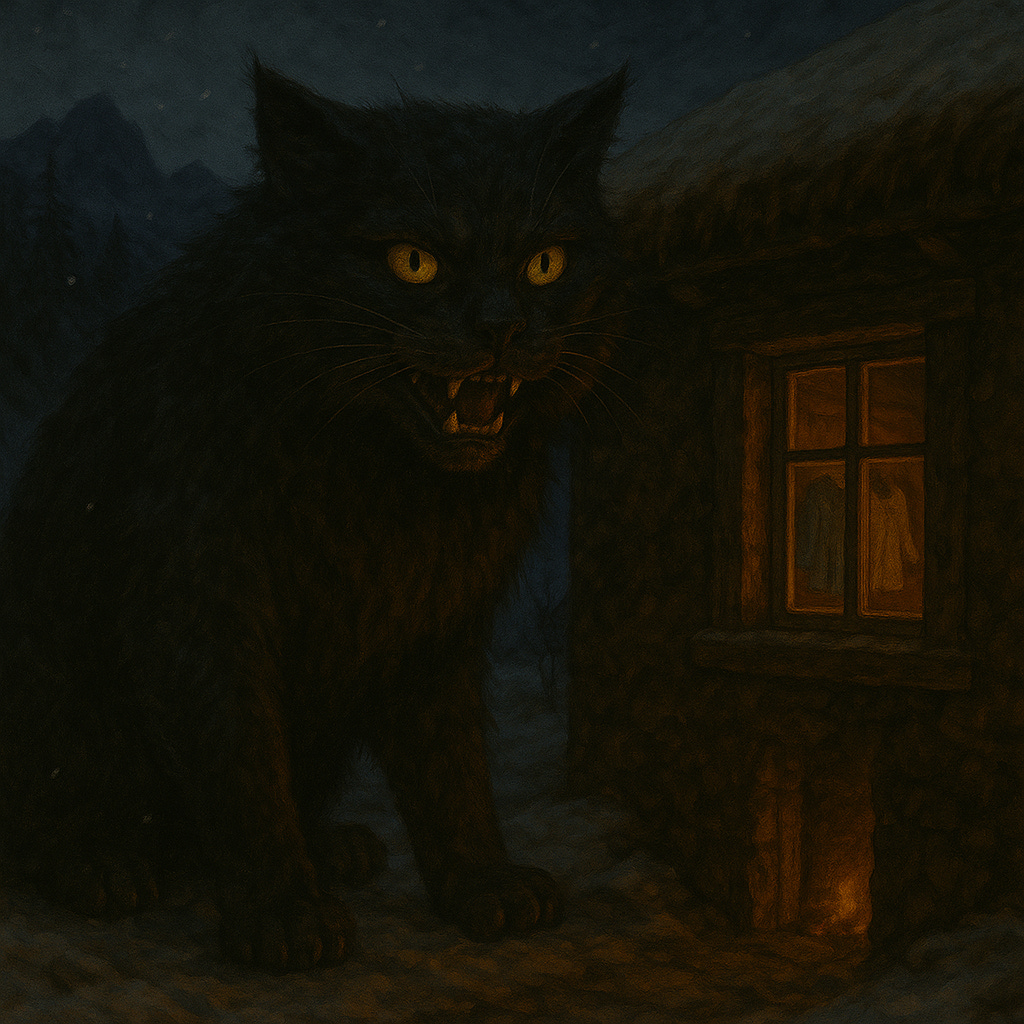 The creature is enormous, larger than any house. Its fur is matted and filthy, its eyes glow in the darkness, and its teeth can tear a human apart in seconds. It stalks through the winter night, peering through windows, searching for victims. The Yule Cat can smell poverty and idleness from miles away. When it finds someone wearing old, threadbare clothes on Christmas Eve, it strikes.