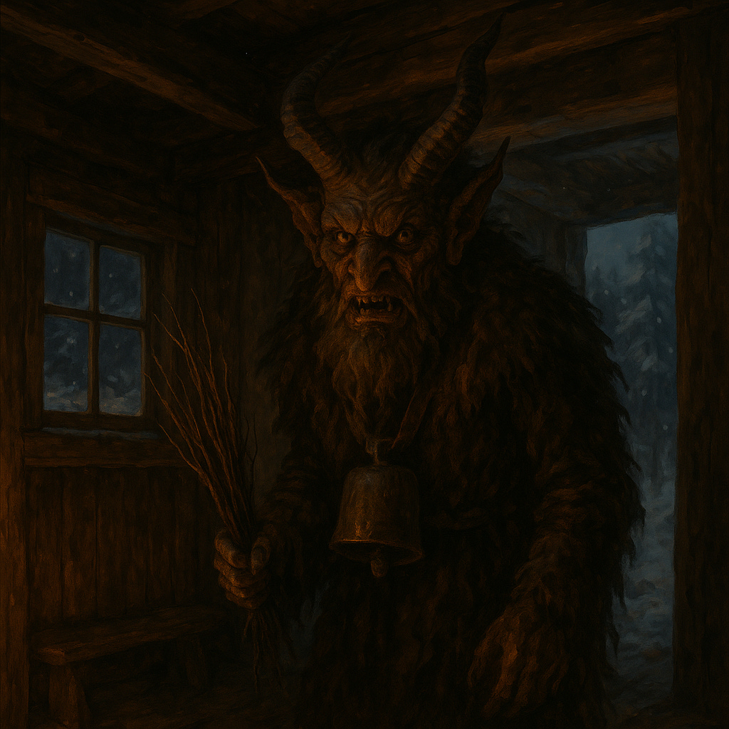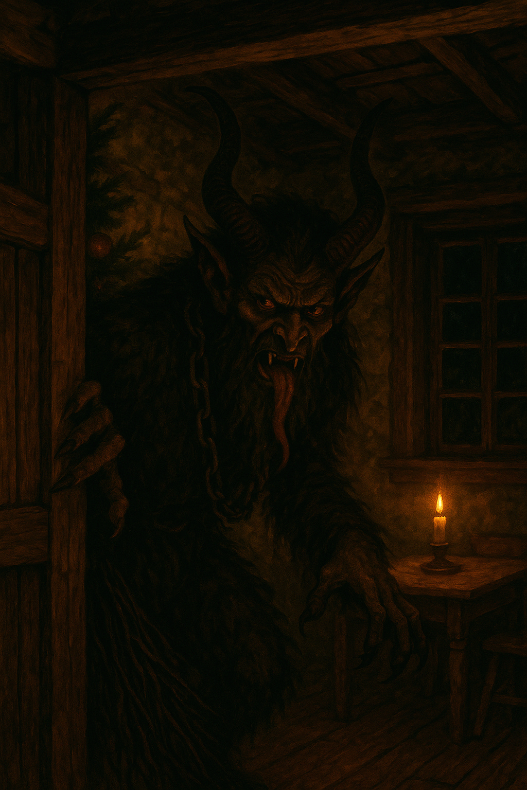 His appearance is monstrous. Long curved horns sprout from his head. His face twists into a leering grimace, tongue lolling past his chin. Cloven hooves, sharp claws, and a body covered in dark shaggy hair complete the nightmare. The chains dragged behind him clank and rattle through the winter streets. In one hand he carries birch rods for beating, in the other a wicker basket large enough to hold a child.St Nicholas arrives first at Alpine homes, questioning children about their behaviour. Those who have been good receive small gifts: nuts, apples, gingerbread. But when a child has misbehaved, St Nicholas steps aside. The door opens again, and Krampus enters. He beats the worst children with his switches, leaving welts across their legs whilst parents watch. Others he snatches up entirely, stuffing them into his basket. Some accounts claim he takes them to his mountain lair. Others suggest he drowns them, eats them, or drags them to hell.