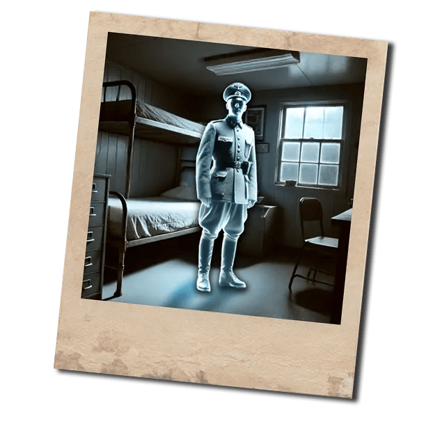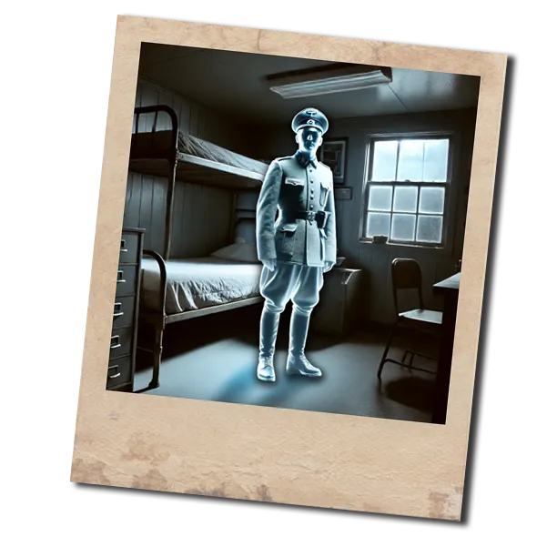 Another sighting involved a female soldier who reported seeing a man in an SS uniform standing at the foot of her bed. She awoke in the middle of the night to find him silently watching her. Paralyzed with fear, she watched as the figure slowly faded away, leaving behind only a cold chill in the air. After that night, she refused to sleep alone in her room again.