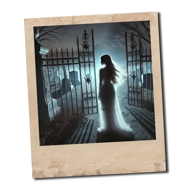 In the 1970s came the most infamous event associated with Resurrection Mary: the cemetery gate incident. A driver travelling Archer Avenue late one night picked up a young woman in white who directed him toward Resurrection Cemetery. As they reached the gates she asked to be let out. He watched her walk to the fence and vanish. When he approached the spot he found something that chilled him further: the iron bars were twisted and scorched, with the impressions of hands seared into the metal. Photographs of the damage were published, and the story was reported widely in the Chicago press. Cemetery officials repaired the gates, but many who saw them before the work swore that the handprints were unmistakeable. This incident gave the Mary legend its most tangible piece of evidence and made her one of the most famous ghosts in America.