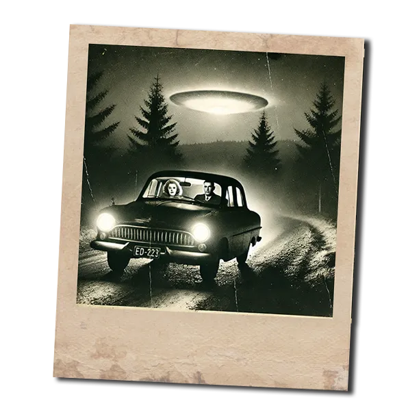 The Hills initially observed a bright light in the sky that exhibited strange behavior—moving erratically and following their car. As the object came closer, it revealed itself to be a disc-shaped craft with humanoid figures visible through its windows. After stopping to observe the craft more closely, the Hills experienced a period of “missing time” during which they had no recollection of events. When they regained consciousness, they found themselves miles down the road with vague, unsettling memories and physical signs of an unusual encounter.