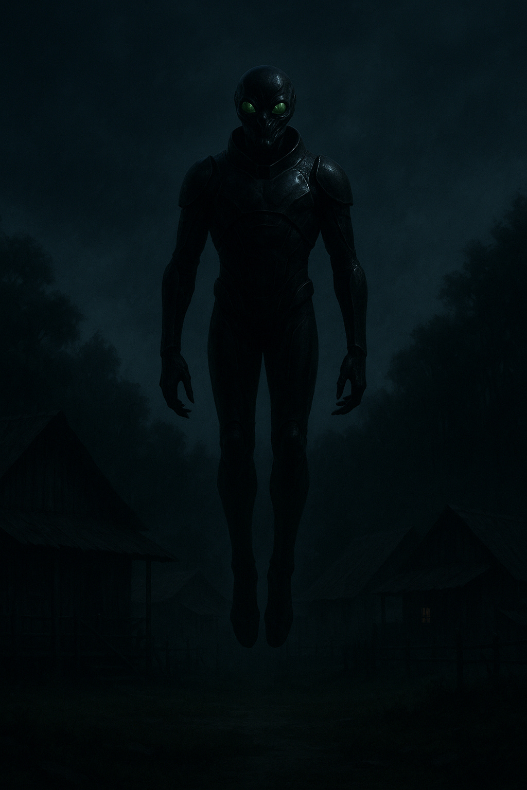 Tall, Hooded Apparitions: Witnesses describe figures standing well over average human height, clad in dark, armour-like suits that obscure all features. Some accounts report them hovering above the ground or river surface.