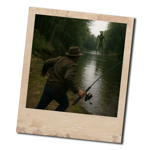 In 2001, a local man named Curtis J. was fly fishing not far from Stephen’s State Park. A lifelong outdoorsman, Curtis knew the habits of the river where the trout gathered, how the light played tricks through the trees. He was mid-cast when he noticed what he first thought was another fisherman, standing about twenty feet upstream. The figure was tall, nearly impossibly so. Curtis blinked. There was something wrong with the shape: no hat, no rod, no gear. The torso looked too narrow, and the arms were hanging too far below the knees. The head was large, triangular. He called out, expecting perhaps a lost hiker. The figure didn’t move. When he took a step forward, it shimmered just slightly and vanished as if it had never been there.