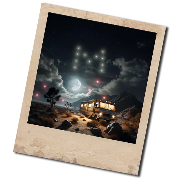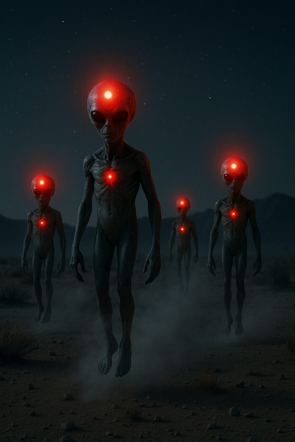 Small humanoid shapes hovered just above the desert floor, illuminated by the red orbs affixed to their heads or shoulders. They moved with unnatural precision, not walking but gliding, closing the distance to the RV rapidly and without sound. Their proportions were wrong—heads too large, limbs too spindly, movements too smooth.
