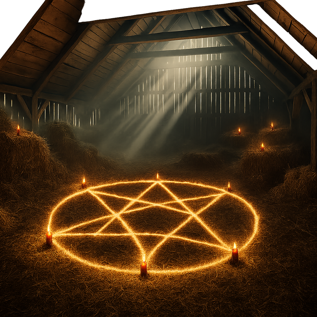 Inside, the air felt heavy, oppressive. On the floor, she discovered a scorched pentagram surrounded by crude sigils. Though she noticed no audible activity at the time, she was recording with a handheld device. A sudden and inexplicable pain struck her abdomen—sharp and searing—and was followed by an overwhelming urge to leave. She did.