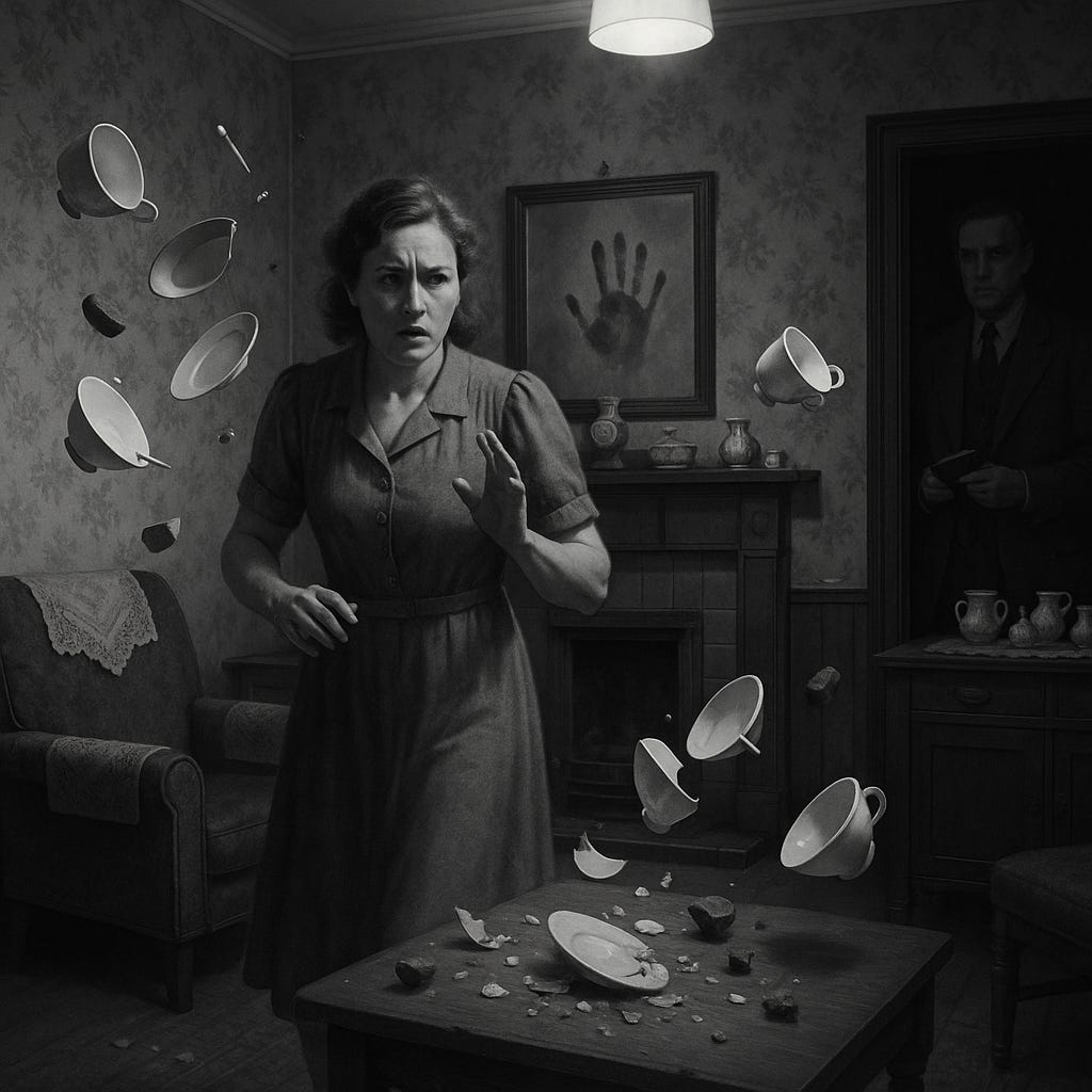The disturbances did not cease with daylight. Over the days that followed, the activity intensified in both frequency and violence. Crockery became a particular focus of the manifestations. Plates, cups, and saucers flew off shelves without being touched, sailing through the air and smashing against walls or floors. Saucers held in Alma’s hands would suddenly split cleanly in two. Glasses shattered whilst people were drinking from them.
